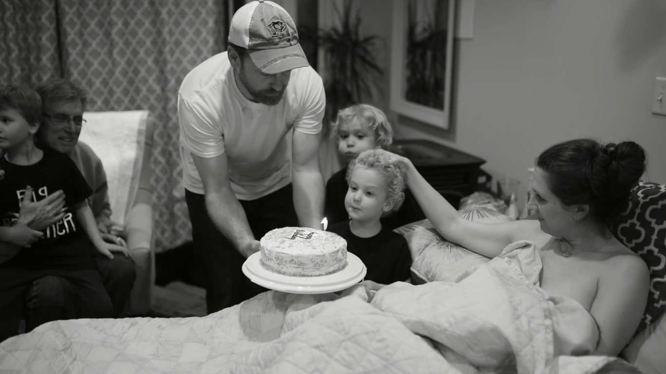 The boys were eager to celebrate baby’s birth with a party; something they had been planning for and actively took part in creating during her labor, along with their Gram (my mom). They brought a sweet white cake with pink sugar that they had baked for their sister. We wore party hats. They decorated our birth room with pom-poms and streamers in honor of her birth. We ate wonderful food prepared by my mom. The boys were proud of their contribution to her birthday and it was a special moment -- to be singing Happy Birthday to our girl of a couple hours old in the comfort of our home and surround by so many people that already loved her. The pomegranate champagne toast was amazing, too.
